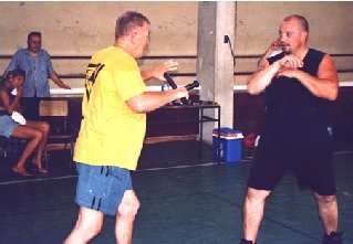 GM Bill Newman zeigte verschiedene Anwendungen aus den Bereichen Schwert, Schwert und Buckler, Espada y Daga, Tonfa, Langstock, Single Stick und Short Power. Am Ende des Seminars erhielten Falk Welker (Escrima-Assistent Kroatien) und Jürgen Pottiez (Karlsruhe) jeweils den 2.TG. Am vorletzten Seminartag wurde weiter an den Sparringssequenzen des 5.SG geübt. So kamen unter anderem in den Technikerprogrammen die Sparringssequenzen mit Schwert und Buckler, Langstock sowie Dos Manos zur Anwendung (Transition).